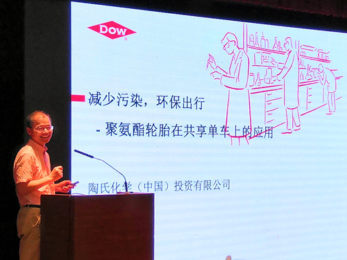 “工业垃圾可再生资源”专场由协会魏建华会长主持,协会理事单位上海应用技术大学欧阳春发教授、陶氏化学(中国)投资有限公司聚氨酯高级应用开发专员焦建清工程师分别作了“废旧氨纶固相力化学可控降解及高交联度聚氨酯醇解产业化展望”、“减少污染,环保出行——聚氨酯轮胎在共享单车上的应用”的报告,专题探讨工业垃圾的可再生利用。
